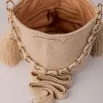 Mochila tejida a mano por indígenas wayuu, elaborada en un solo tono, adornada con terminaciones en campanas y aros dorados o plateados, que realzan su belleza, tiene una cargadera removible tejida para ser usada como mochila y adicional una manija tipo cadena de alta calidad que permite su uso como un bolso de lujo de mano. Es un producto versátil que permite varios usos, sin perder su elegancia y esencia artesanal wayuu.