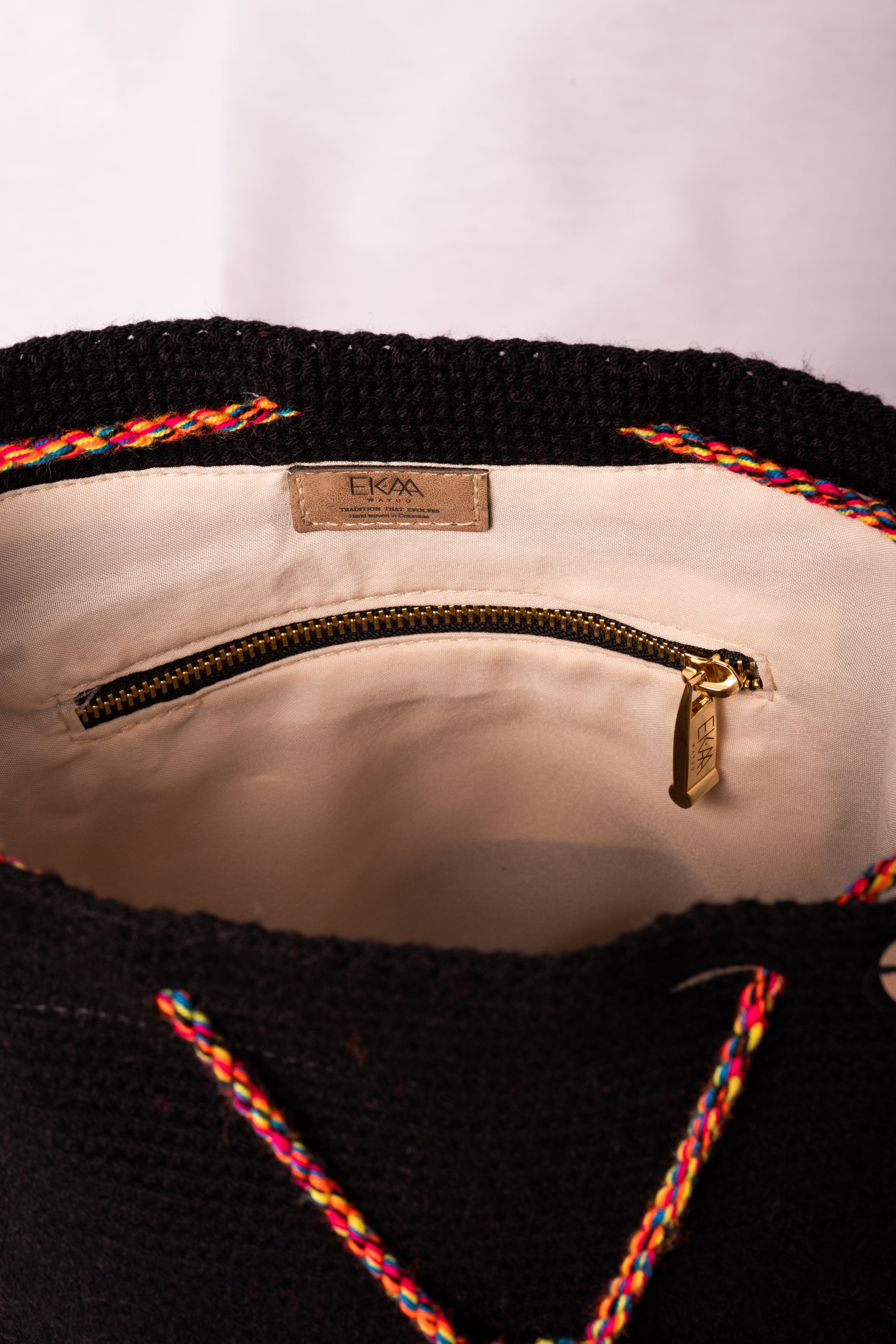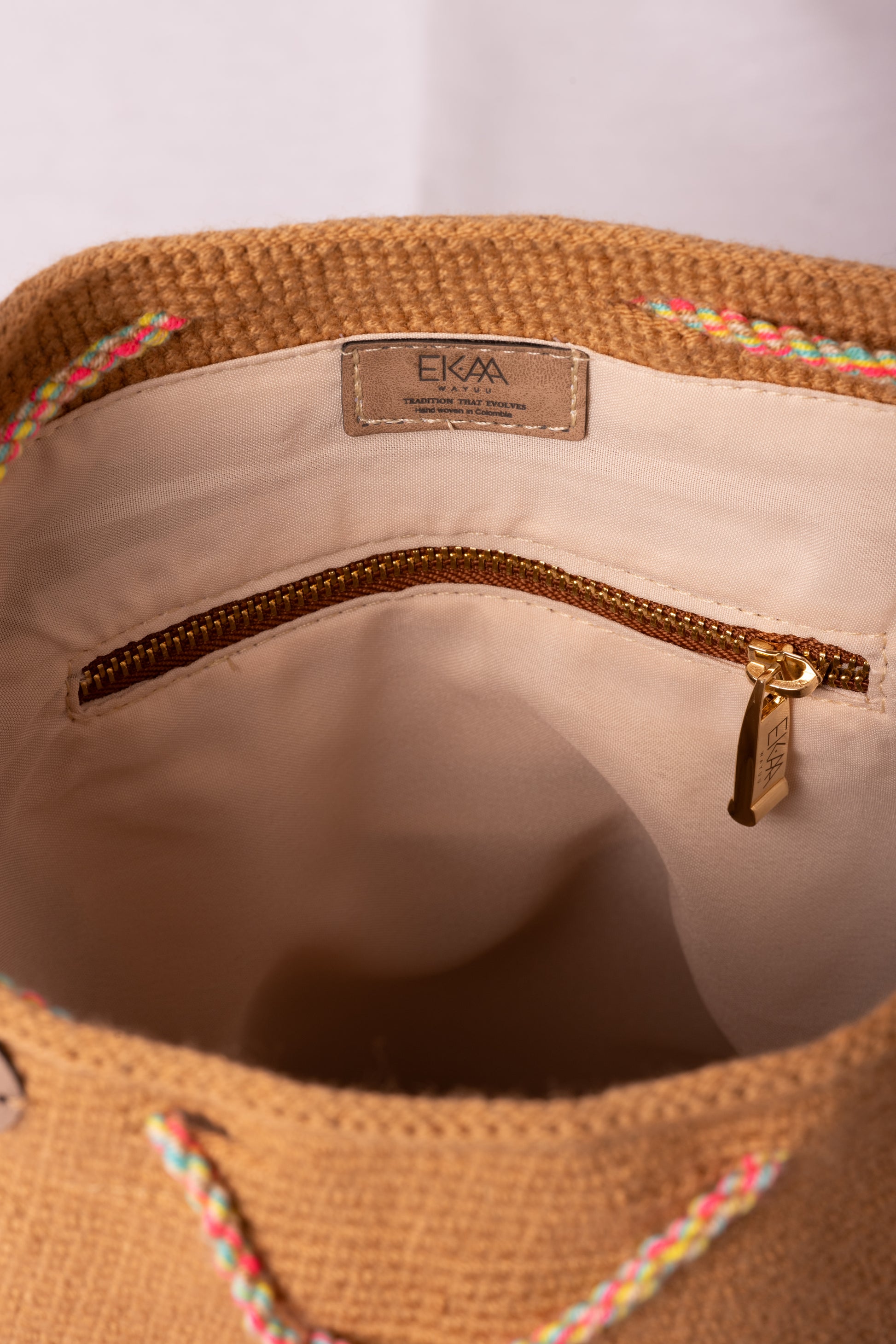 Mochila de un solo color, adornada con gaza multicolor que realza su belleza. puedes elegir la terminación del cordón, en borlas o campanas. Este diseño es elaborado totalmente a mano por indígenas de la etnia wayuu, el arte del tejido se ha transmitido de generación en generación, conservando su riqueza y calidad, el tiempo de manufactura tarda alrededor de 8-12 días. El material utilizado es hilo de algodón de crochet. Mediadas aproximadas: 28 CM X 28 CM cada mochila es única y hecha a mano, por lo tanto las medidas nunca son exactas.