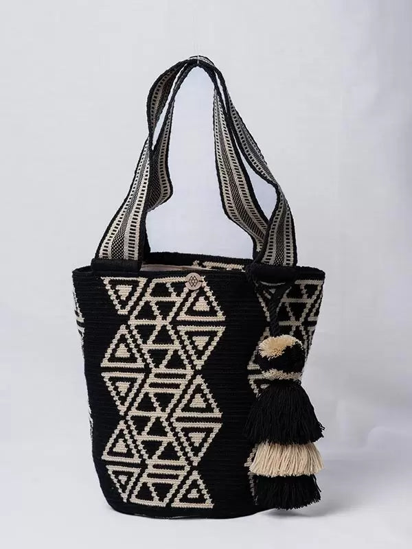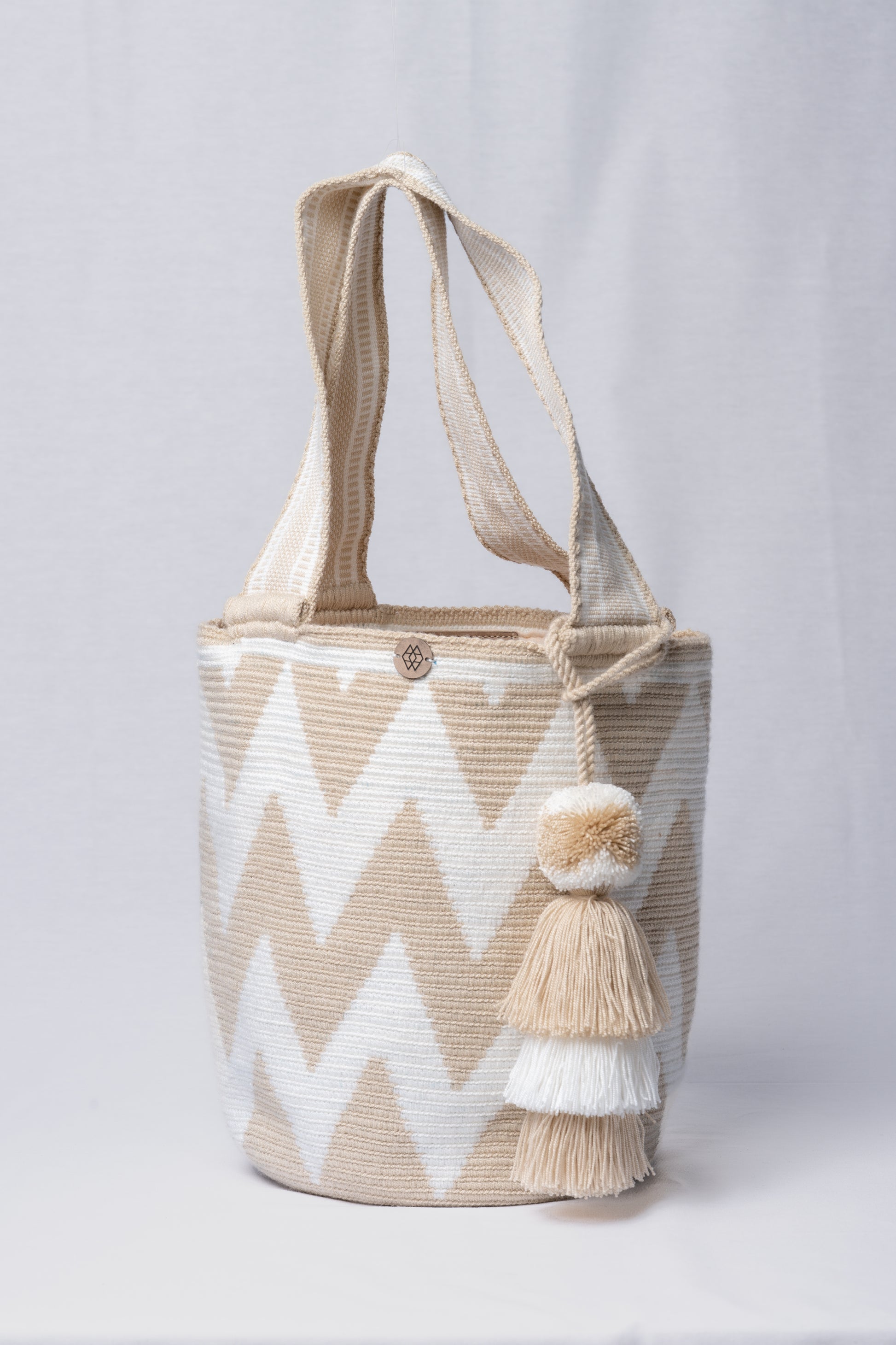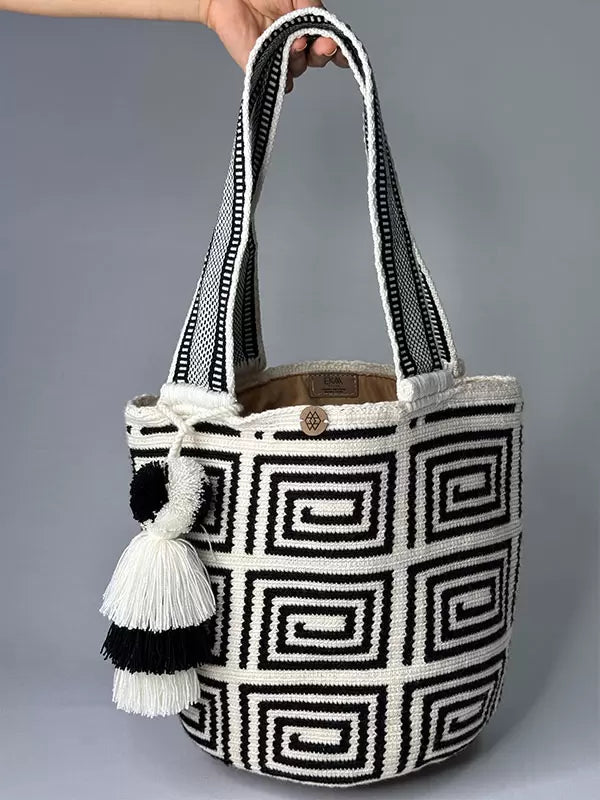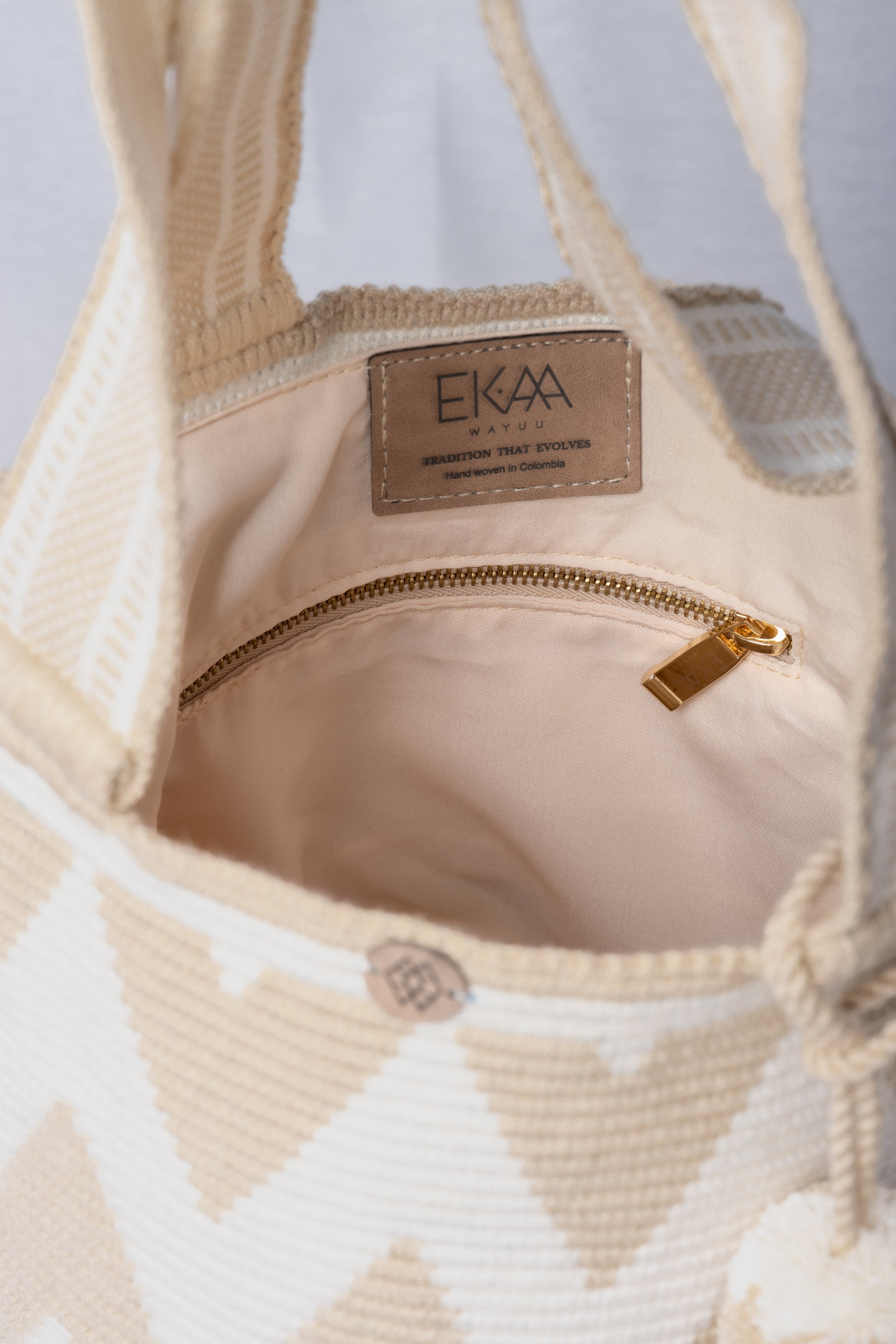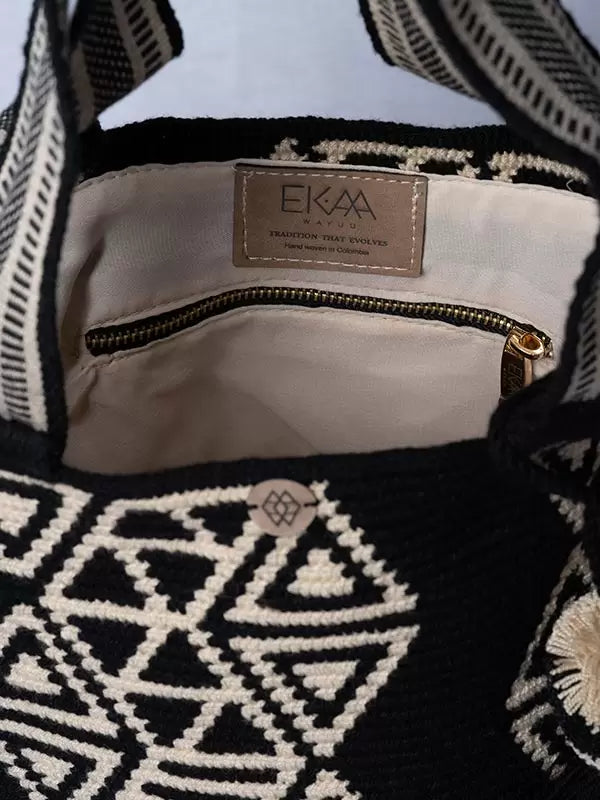 Su diseño amplio permite llevar gran variedad de útiles y accesorios, lo que hace de este bolso un elemento versátil para usar en cualquier ocasión, manteniendo siempre la tradición ancestral de la comunidad wayuu. El bolso cuenta con forro y bolsillo interno premium marca Ekaa.