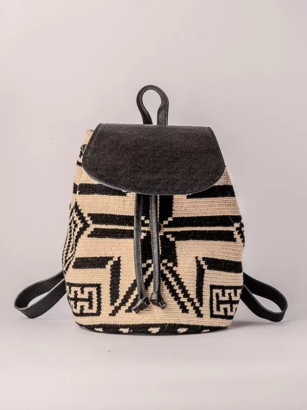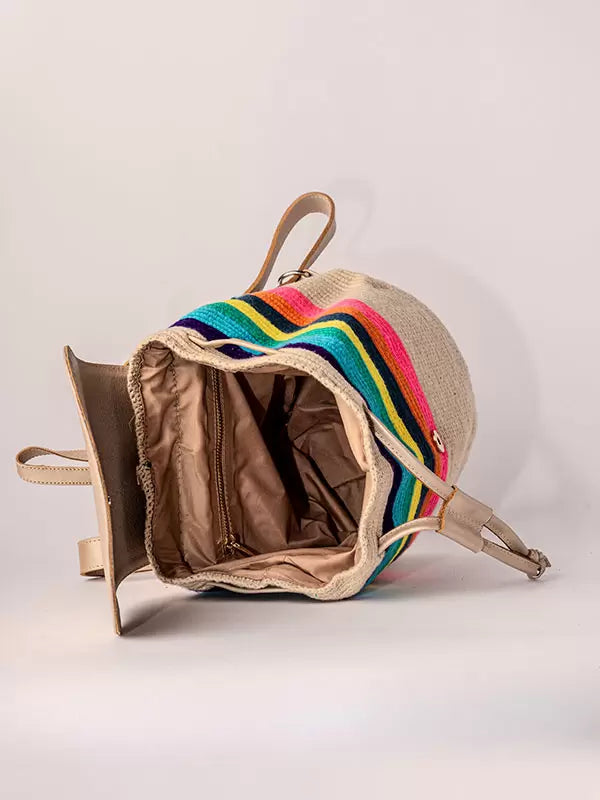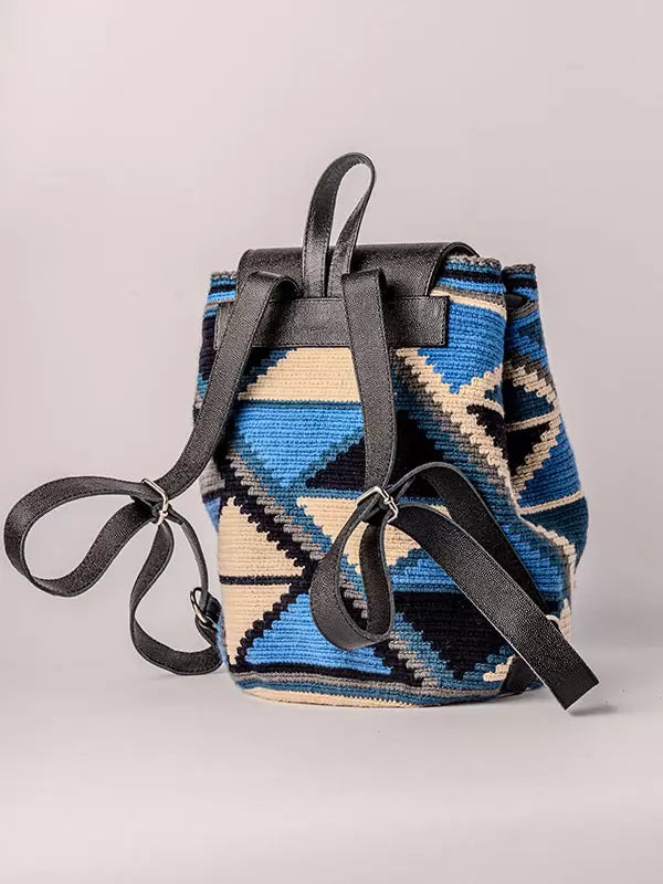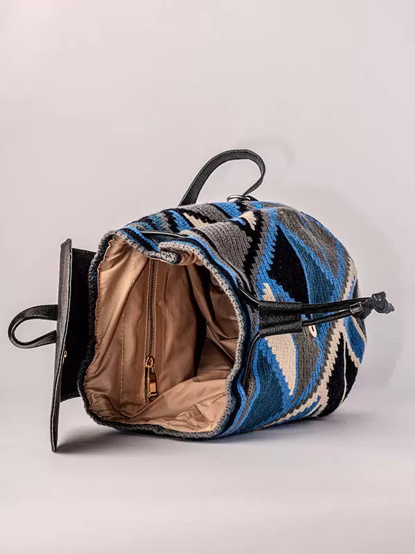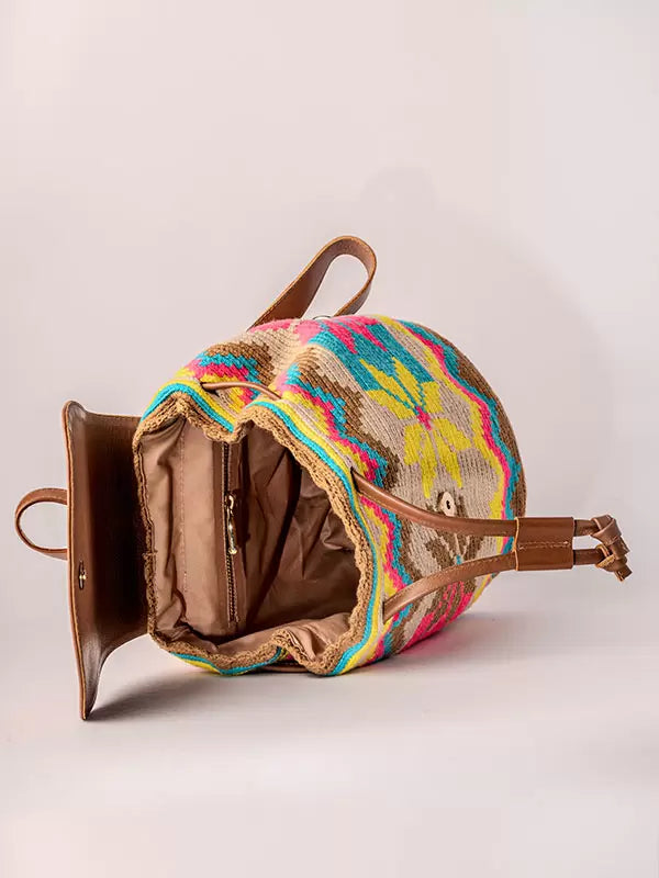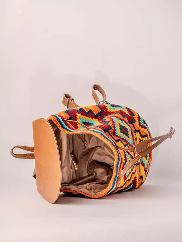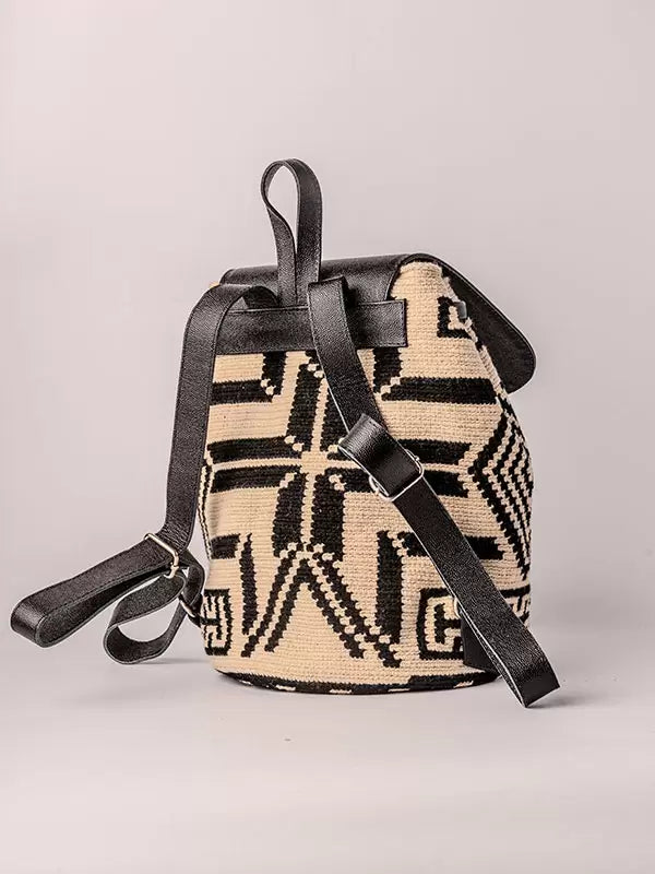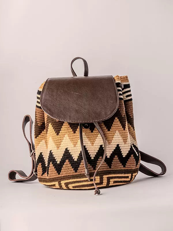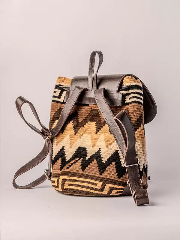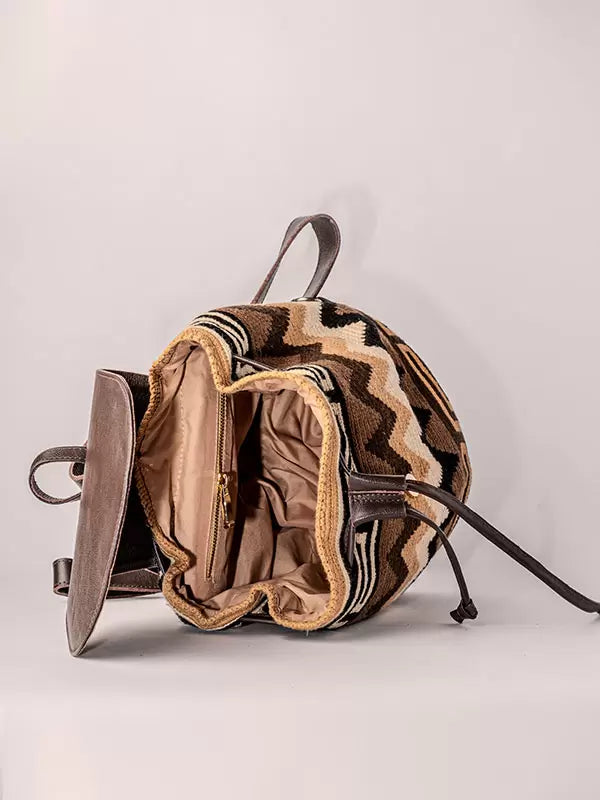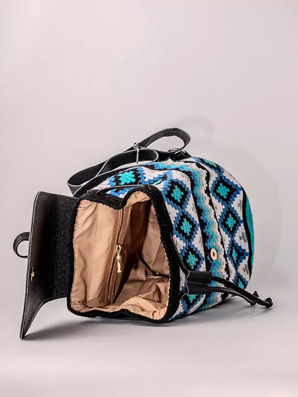 El morral Ekaa, ofrece un estilo moderno y versátil, con un toque cultura y ancestralidad, combina una base tejida a mano por indigencias wayuu desde el corazón de la Guajira con cuero auténtico de alta calidad utilizado para elaborar la tapa, las cargaderas y el lazo del cierre del bolso.