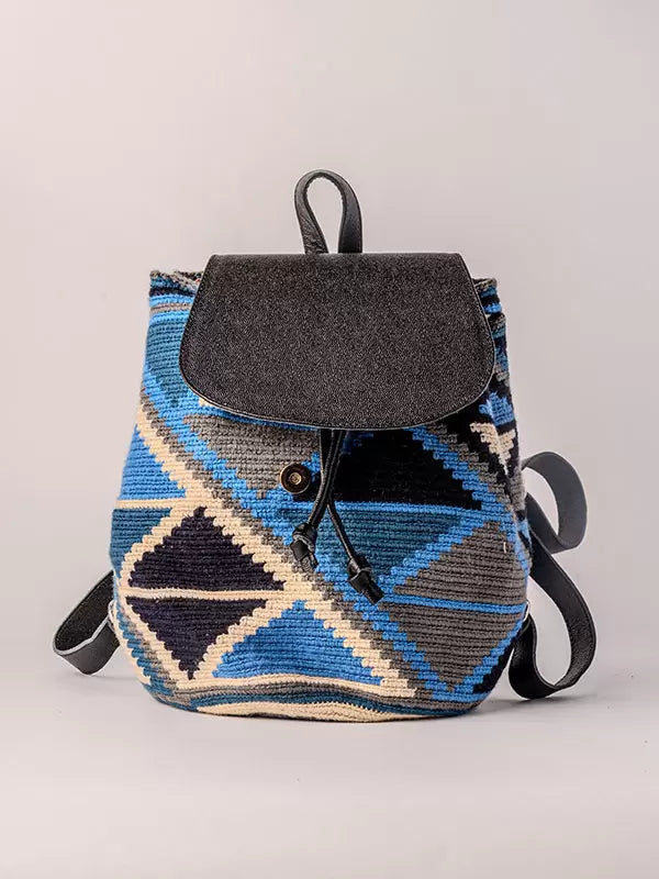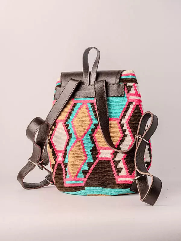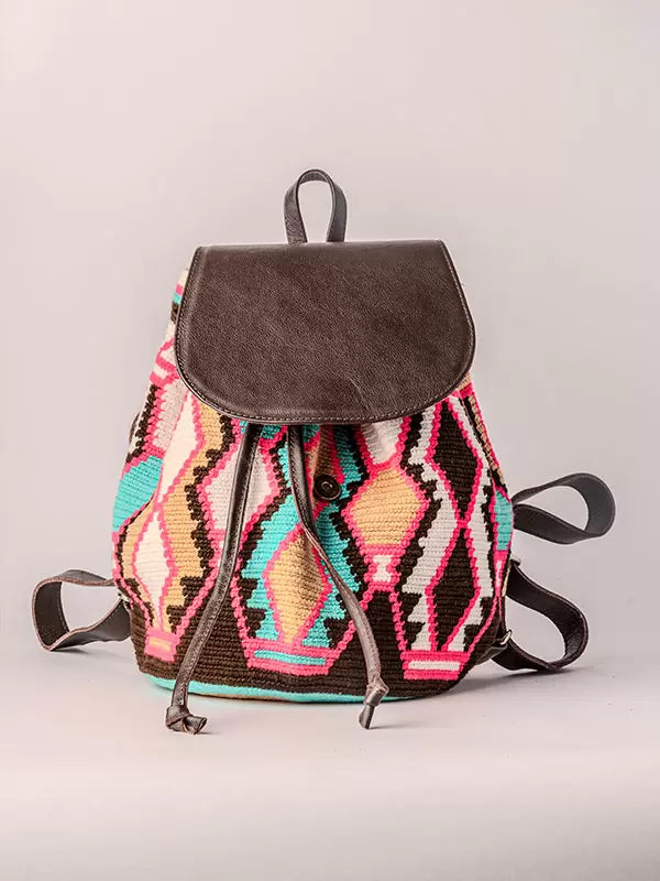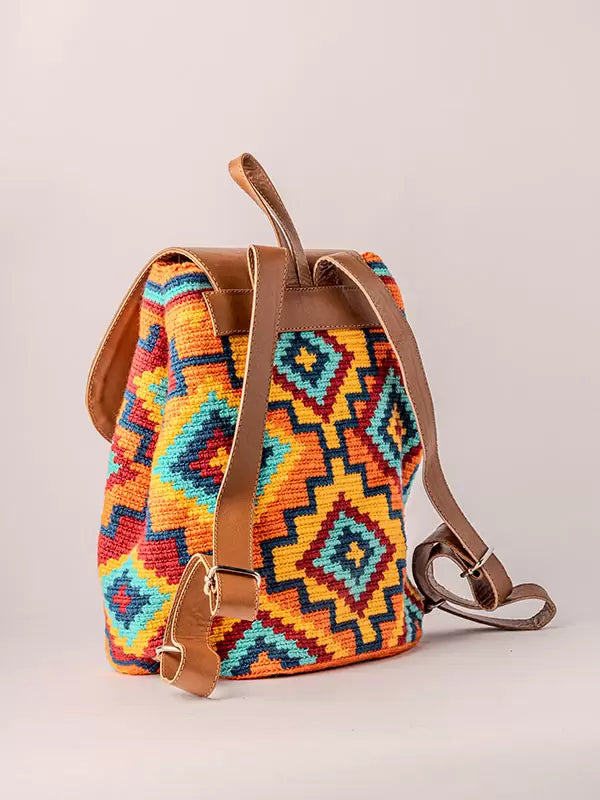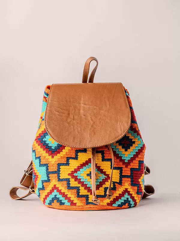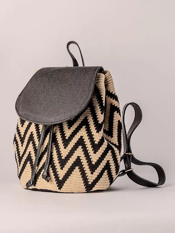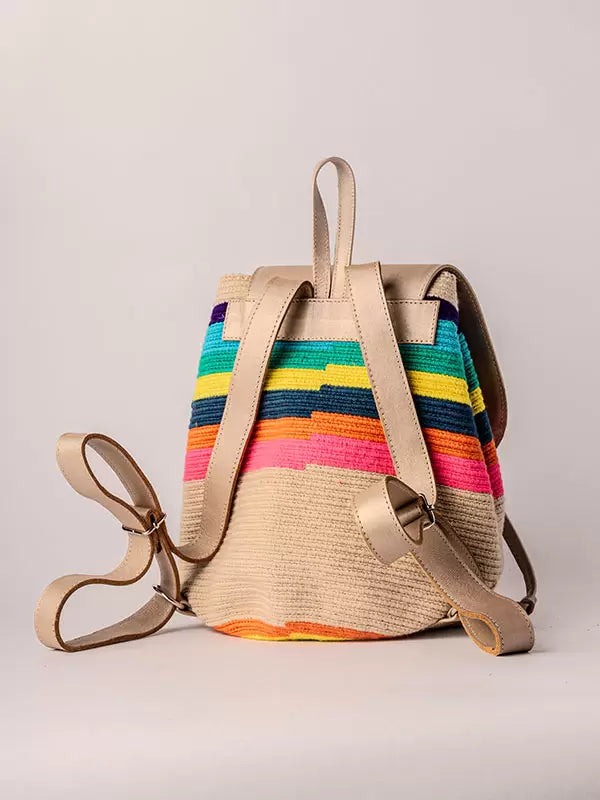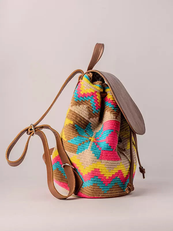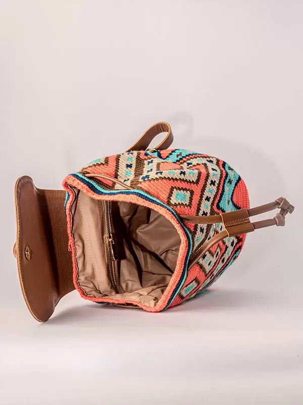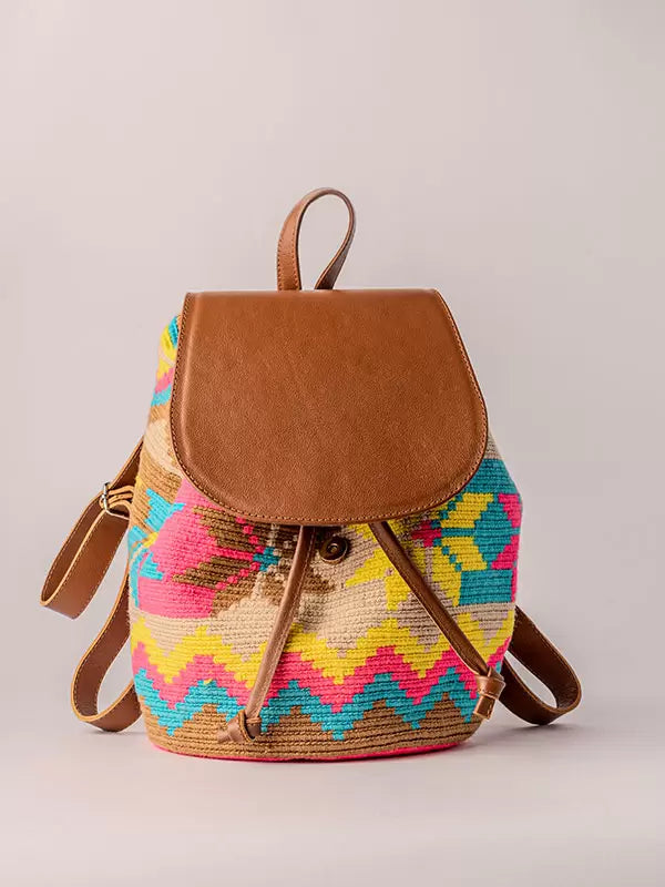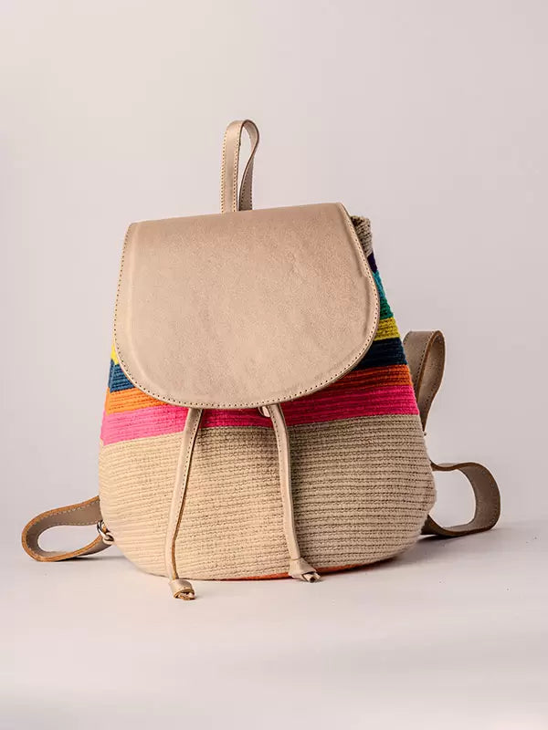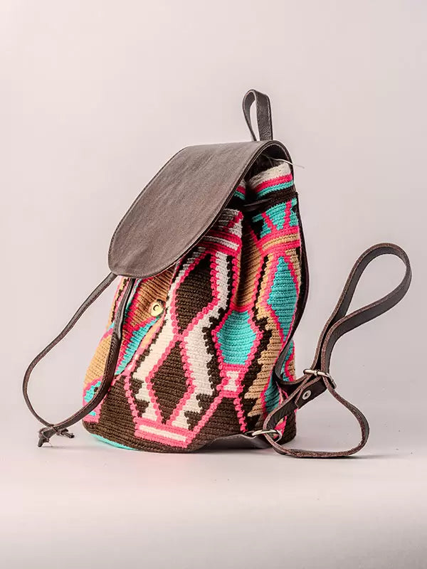 El morral Ekaa, ofrece un estilo moderno y versátil, con un toque cultura y ancestralidad, combina una base tejida a mano por indigencias wayuu desde el corazón de la Guajira con cuero auténtico de alta calidad utilizado para elaborar la tapa, las cargaderas y el lazo del cierre del bolso.
