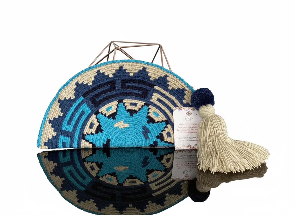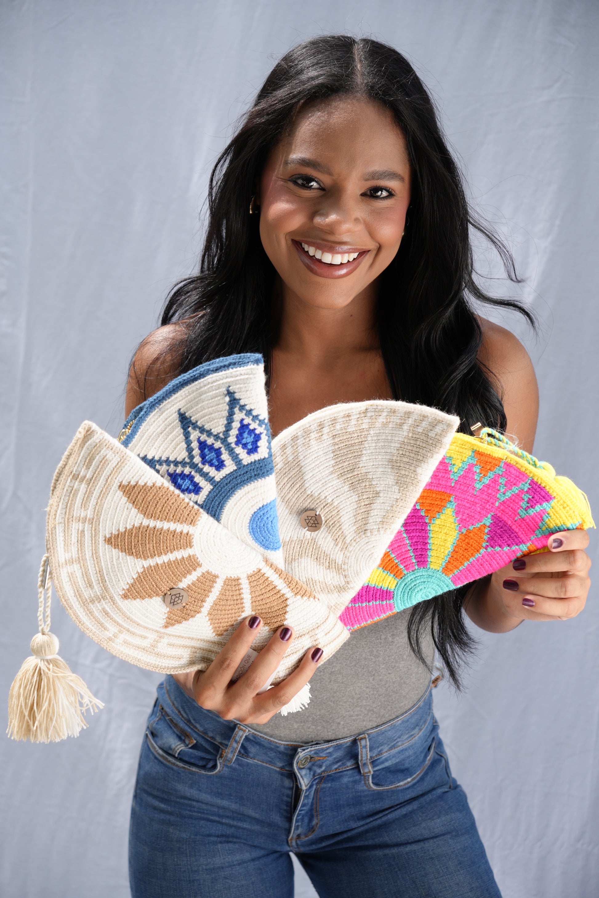 Sobres de mano también conocidos como Clutch son elaboración a mano por mujeres indígenas de la etnia wayuu con la técnica de tejido y elaborados en forma circular el tiempo de manufactura tarda alrededor de 1-2 días.