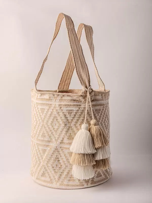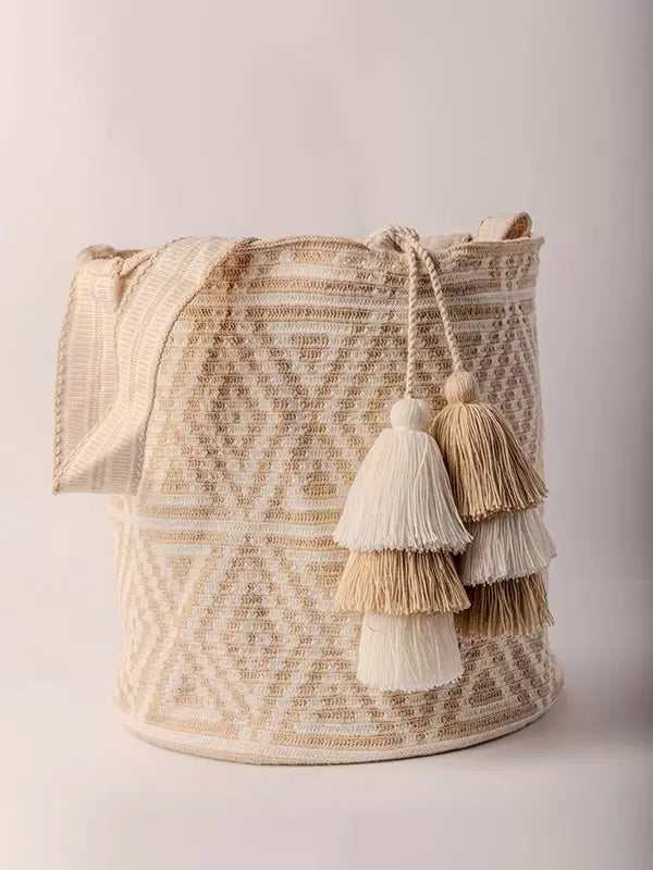 La mochila Susu, es la más bella expresión del pensamiento y vivencias de la mujer wayuu, que plasma en su tejido su manera de ver la vida, los patrones y colores utilizados representan el paisaje de las rancherías wayuu, animales, árboles y astrología.